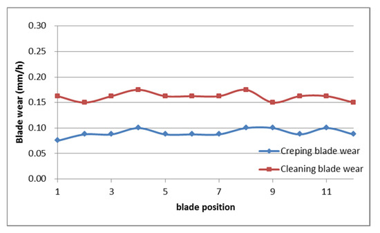 Creping and cleaning blade wear as a function of time.