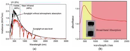 (a) Standard terrestrial solar spectral irradiation distributions by the American Society for Testing and Materials (ASTM G173). Reproduced from Ref. [64] with permission. Copyright 2017, Elsevier, and (b) absorption spectrum of ZrC nanoparticles. Reproduced from Ref. [67] with permission. Copyright 2017, Elsevier.