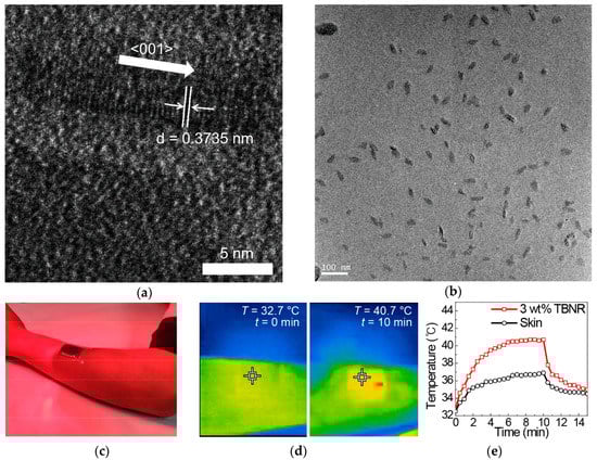 HR-TEM images of (a) Na0.33WO3 TBNRs, (b) EPDM/TBNR nanocomposites with 3 wt % TBNR, (c) an optical image of an arm with a patch of a nanocomposite film with 3 wt % TBNRs under NIR irradiation by a medical NIR lamp, (d) NIR images of the arm at 0 and 10 min under NIR irradiation, and (e) photothermal temperature increases of the skin and patch including 3-wt % Na0.33WO3 TBNRs under NIR light irradiation for 10 min, followed by temperature decreases after turning off the light. Reproduced from Ref. [83].
