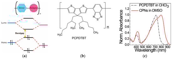 (a) Simplified electronic structure of donor-acceptor copolymer chains with a low bandgap. Reproduced from Ref. [95] with permission. Copyright 2017 John Wiley and Sons, (b) chemical structure of PCPDTBT and (c) its absorption spectra in chloroform solution and CPNs. Reproduced from Ref. [102].