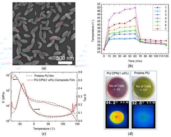 (a) Scanning electron microscopy (SEM) image of PCPDTBT nanoellipsoids, (b) temperature variation profiles under white light irradiation for 60 min and after turning off the light for another 60 min for (1) pristine PU, PU composite films with (2) 1 wt % OA, (3) 1 wt % Ag nanoparticles, (4) 1 wt % PCPDTBT, (5) 0.25 wt %, (6) 0.5 wt % and (7) 1 wt % CPNs, (c) dynamic mechanical analysis data of pristine PU and PU-CPN composite film at 1 wt %, and (d) optical images of bacterial cell cultures on films of PU-CPN composite and pristine PU films and infrared images after white light irradiation. Reproduced from Ref. [101] with permission. Copyright 2018, Elsevier.