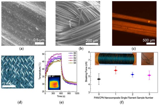 SEM images of (a) a nanocomposite fiber of PAN with 0.75 wt % CPNs, (b) fabric based nanocomposite fibers, (c) fluorescent (excited at 650 nm) images of yarn based on nanocomposite fibers, (d) an optical image of fabrics prepared from yarns based on PAN/CPN nanocomposite fibers, (e) photothermal response of the textiles fabricated using PAN/CPN nanocomposite fibers at 0.75 wt % of CPNs under white light irradiation for the first 600 s, followed by 600 s after turning off the light, with an infrared thermal image under white light irradiation at t = 600 s, and (f) breaking forces measured by single filament tensile experiments of pristine PAN fibers (filament 0), nanocomposite fibers before knitting the textiles (filament 1, left inset image), after knitting followed by deknitting without washing (filament 2), and after washing in a laundry machine followed by deknitting (filament 3, right inset image). Reproduced from Ref. [102].