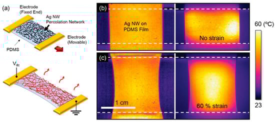 Highly stretchable and transparent heater. (a) Schematic illustration of the stretchable and transparent heater composed of an Ag NW percolation network on PDMS film, (b,c) pseudocolor image at room temperature (left) and infrared camera thermal image (right) of an Ag NW/PDMS stretchable and transparent heater operating at 60 °C with (b) no strain and (c) at 60% strain condition. Reproduced from Ref. [108] with permission. Copyright 2015, John Wiley and Sons.