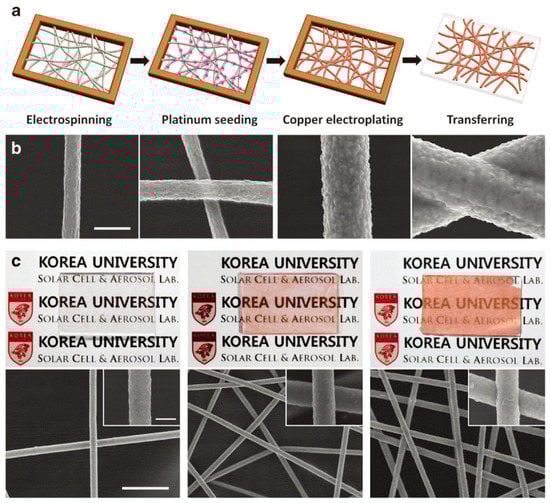 - An, S.; Kim, Y.I.; Jo, H.S.; Kim, M.-W.; Swihart, M.T.; Yarin, A.L.; Yoon, S.S. Oxidation-resistant metallized nanofibers as transparent conducting films and heaters. Acta Mater. 2018, 143, 174–180. [Google Scholar] [CrossRef]