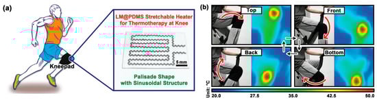 (a) Optical photo of a specially designed LM@PDMS stretchable wearable electronically driven heater (WEDH) and schematic illustration of its working condition. The pattern of this heater is palisade shape with sinusoidal structure to perform thermotherapy on the knee, and (b) optical photos of exercise at different states and the corresponding IR thermal images. Kneepad worn by a volunteer is embedded with the LM@PDMS stretchable WEDH of (a). Reproduced from Ref. [110] with permission. Copyright 2019, John Wiley and Sons.