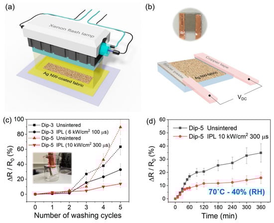Schematic of (a) IPL sintering system for Ag nanowire-fabrics, (b) Ag nanowire-fabrics with copper tape adhered to the fabric using silver paste for applying DC voltage and measuring resistance of the fabric patch, (c) the normalized change in sheet resistance after a washing test for Dip-3 (black) and Dip-5 (red) Ag nanowire-fabrics before (dotted line) and after (solid line) IPL irradiation. Inset shows the washing test setup. The evolution of normalized change in sheet resistance for the Ag nanowire-fabrics before- (black) and after- (red) IPL irradiation under different temperature and humidity conditions, and (d) Dip-5, 70 °C-40% relative humidity, Dip-5 IPL parameters: 10 kW·cm−2, 300 μs. Reproduced from Ref. [115].