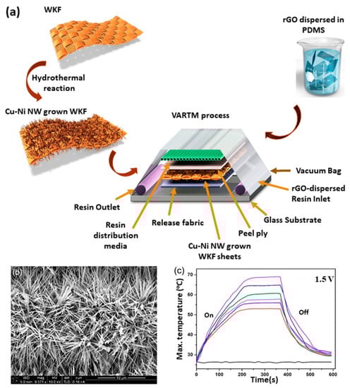In contrast, conductive materials can be coated on the surface of fabrics by chemical reactions. Vertical Cu-Ni NWs were directly grown on woven Kevlar fiber (WKF) via a hydrothermal reaction and combined with RGO dispersed in PDMS via a vacuum-assisted resin transfer molding (VARTM) process (Figure 13) [121]. The resulting composite exhibited excellent performance as a Joule heater, reaching 70 °C at 1.5 V. Furthermore, IR from the human body can be reflected back, thereby providing increased thermal insulation of 43%. Ni was also deposited onto silk fabrics [122]. Kapton tapes with a pre-cut interdigital pattern were attached to pre-cleaned silk fabrics, followed by an electroless plating process of Ni electrode patterns. A GO layer was spray-coated onto these Ni-patterned silk fabrics to act as a humidity sensor. The resulting fabrics could be applied as a flexible humidity sensor for monitoring human respiration. Transparent conducting films and heaters could be fabricated by coating PAN fibers prepared by electrospinning with Ni via an electroplating process [123]. The resulting mats of Ni-coated PAN fibers presented a remarkably low sheet resistance of 0.73 Ωsq−1 at an optical transmittance of 93%, achieving a heating temperature of 373 °C at an applied voltage of 2 V. As a representative organic conductive material, conjugated polymers such as polyaniline, poly(3,4-ethylenedioxythiophene) and PPy could be coated on fabrics by a vapor phase polymerization, an electrochemical polymerization, in-situ solution polymerization or inkjet/blade printing, as recently reviewed [124]. For example, PPy was synthesized on the surfaces of cotton and nylon fabrics via in-situ polymerization with FeCl3 [125,126,127]. The operating temperature of the resulting Joule heaters based on PPy-coated cotton fabrics was in the range of 28–83 °C at an operating voltage of 3–9 V with a sheet resistance of 303 Ωsq−1 [127] and demonstrated multifunctionalities with superhydrophobicity and self-cleaning effects [126].