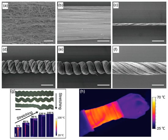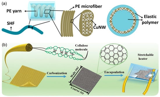 In addition to surface coating technologies by conductive materials, various technologies have been reported to prepare conductive fibers and use them as woven textiles. In a hierarchical structure of a stretchable heating fiber (SHF), Cu NWs were coated onto a helical yarn of polyester microfibers, followed by encapsulation of the fibers with silicone rubber (Figure 14a) [128]. The resulting SHF could reach a temperature range of 20–57 °C at a low applied voltage of 3 V, within 20 s. A Joule heater could be directly prepared from commercially available fabric (Figure 14b) [129]. Weft-knitted Modal fabric was carbonized under an argon and hydrogen mixed atmosphere at an elevated temperature of 1050 °C for 200 min, thus preserving the stretchability of the carbonized textile by slow heating and cooling. The carbonized fabrics were then wired with a Cu electrode and encapsulated by Ecoflex silicon rubber. The resulting stretchable heater showed a heating temperature higher than 100 °C at a driving voltage of as low as 3 V, without deterioration of the Joule heating performance, even under a large strain of 70%.