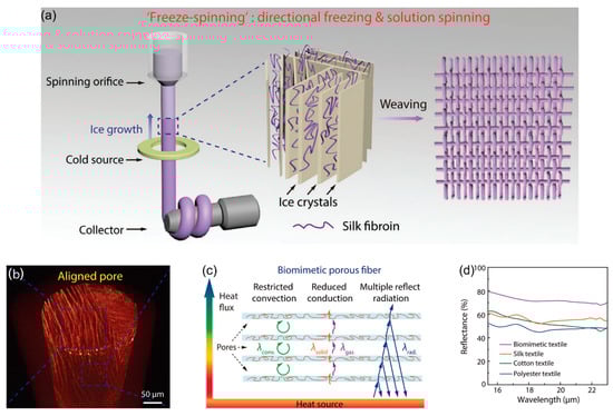 (a) Schematic illustration of the “freeze spinning” technique, combining “directional freezing” with “solution spinning” to realize continuous and large-scale fabrication of biomimetic fibers with aligned porous structure, mimicking polar bear hair. The silk fibroin solution extruded from a pump-controlled syringe is gradually frozen when it passes through a cold copper ring. Collected by a motor, the frozen fiber is further freeze-dried to reserve its porous structure and subsequently woven into a textile, (b) X-ray computed microtomography image showing the aligned lamellar pores within the biomimetic fiber along its axial direction, (c) schematic illustration of thermal conductivity of the biomimetic porous fiber with aligned pores, and (d) infrared light reflectance measurement of different textiles with similar thicknesses (≈ 0.4 mm) performed using a Fourier transform infrared (FTIR) spectroscopy microscope: biomimetic, silk, cotton, and polyester textiles are compared. Reproduced from Ref. [131] with permission. Copyright 2018, John Wiley and Sons.