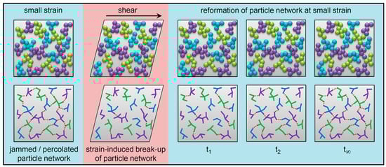 Illustration of the effect of shear strain on the particle network in a filled elastomer and the subsequent time-dependent reformation process. The different colored aggregates in the upper diagrams represent fused primary particles, and these aggregates are the smallest dispersible units of nano-structured fillers such as carbon black and precipitated silica. The lower diagrams illustrate the connectivity of the filler network, with solid lines showing fused connections of primary particles within aggregates and dashed lines showing aggregate–aggregate (filler–filler) contacts.