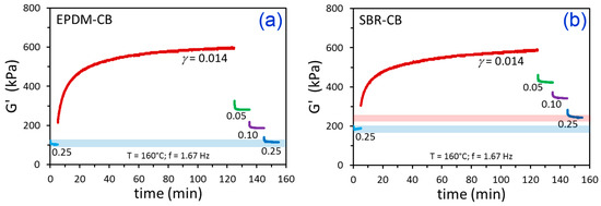 Time-dependent G’ results for the indicated strain amplitude history for EPDM-CB (a) and SBR-CB (b). The blue bar in (a) represents the similar starting and ending values of G’ at γ = 0.25. In (b), the blue bar is the starting G’ at γ = 0.25 and the pink bar is the final G’ at γ = 0.25, which is higher.