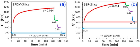 Time-dependent G’ results from the indicated strain amplitude history for EPDM-Silica (a) and SBR-Silica (b). The blue bar in (a) represents the similar starting and ending values of G’ at γ = 0.25. In (b), the blue bar is the starting G’ at γ = 0.25 and the pink bar is the final G’ at γ = 0.25, which is higher.