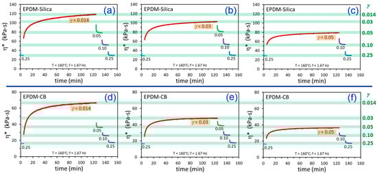 Time-dependent dynamic viscosity results for EPDM-Silica (a–c) and EPDM-CB (d–f) from testing using the indicated strain amplitude histories. The green bars represent the apparent equilibrium η* values at the various values of γ. Note the different y-axis scalings for EPDM-Silica (a–c) and EPDM-CB (d–f).