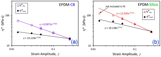 A key observation from Figure 4 is that for each polymer–filler system, there appears to be an equilibrium dynamic viscosity, η*eq, at each value of γ that is independent of the prior strain history path. This is highlighted by the green bars in Figure 4, and the γ-dependence of η*eq displays a power law behavior for both EPDM-CB and EPDM-Silica (Figure 5).