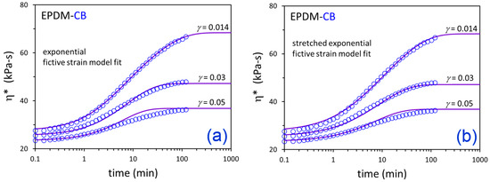 Time-dependent η* data (symbols) after down-jump from equilibrium at γ = 0.25 to the indicated γ values and fictive strain model fits (solid lines) for EPDM-CB using the exponential (a) and stretched exponential (b) versions of the model.