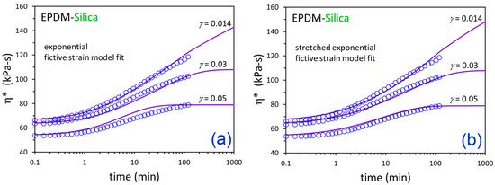 It should be noted that the functional form of Equation (5) is different than a preliminary expression proposed earlier for the relaxation time, τ [32]. At first glance, the expression in Equation (4) looks like a typical stretched exponential growth function, with stretching exponent β. However, the unique part is the relaxation time function, which depends on actual strain through the parameter a and fictive/structural strain through the parameter s (Equation (5)). The fictive strain decreases toward the actual strain during flocculation, thereby imparting a time-dependent increasing nature to τ as filler networking progresses. The γf(t) is assigned from the measured η*(t) using Equation (2), and a visual example of the connection between the time dependence of dynamic viscosity and fictive strain is presented in Figure 6. In fitting the experimental data, we set η*∞ = η*eq from Equation (1). We also fix η*0 = η*inst, where η*inst was assigned from the first datapoint after the strain down-jump when fitting experimental results and was determined using Equation (3) when predicting behavior outside the range of measured dynamic rheology results. The fitting used four varying parameters, a, s, A, and β, for the nonexponential (stretched exponential) version of the model. Only three parameters were allowed to vary for the exponential version of the model, because β was fixed at a value of 1 for that case.