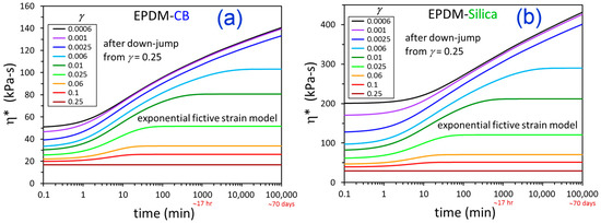Time-dependent η* data (symbols) after down-jump from equilibrium at γ = 0.25 to the indicated γ values and fictive strain model fits (solid lines) for EPDM-Silica using the exponential (a) and stretched exponential (b) versions of the model.
