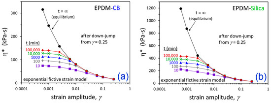 The parameters quantified from fitting the experimental data can be used to predict the filler flocculation behavior at γ and time conditions that are outside the ranges probed in the dynamic rheological measurements. The results are shown in Figure 10. This exercise showed that filler networking at strain amplitudes below 0.006 (0.6%) is predicted to not reach equilibrium for both EPDM-CB and EPDM-Silica until sometime after a flocculation time of 100,000 min (~70 days), which was the longest time considered in the model predictions. Extending the model to these long-time conditions gives such insights that are not otherwise experimentally possible. It would not be realistic to perform rheological experiments for months, and even mostly saturated EPDM would undergo branching/cross-linking during annealing at 160 °C for this duration.