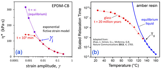 Comparison of departure from equilibrium as strain amplitude is decreased for EPDM-CB (a) with departure from equilibrium liquid behavior as temperature is decreased for 20-million-year-old amber resin glass from Zhao, Simon, and McKenna [54] (b).