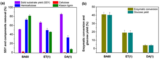 Effects of different pretreatments (DA(2), ET(2), and BA80 pretreatments) conducted at optimized conditions on the (a) components removal and (b) enzymatic hydrolysis efficiency. All pretreatments were conducted at 80 wt % BA content and 80 °C for 60 min.