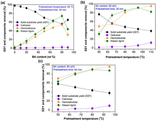 Effects of the pretreatment conditions on the solid substrate yield (SSY) and components removal. (a) BA content effects at 65 °C for 30 min; (b,c) temperature effects at a BA content of 80 wt % for (b) 30 min and (c) 60 min, respectively.