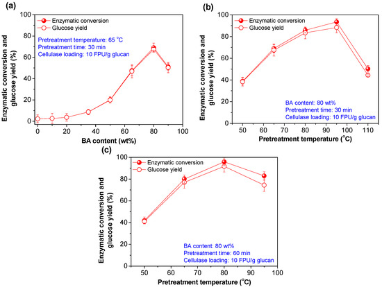 Effects of the pretreatment conditions on the enzymatic hydrolysis efficiency. (a) BA content effects at 65 °C for 30 min; (b,c) temperature effects at a BA content of 80 wt % for (b) 30 min and (c) 60 min, respectively.