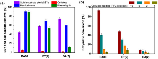 Similar to the results shown in Figure 1, lignin and hemicellulose removal (90.2% and 90.8%, Figure 4a) of substrate pretreated by BA pretreatment at 80 wt % BA (0.68 mol) and 80 °C for 60 min (abbreviated as BA80 pretreatment) were also much higher than those of ET and DA pretreatments (abbreviated as ET(2) and DA(2)) with equimolar loadings of ethanol and hydrogen ions.