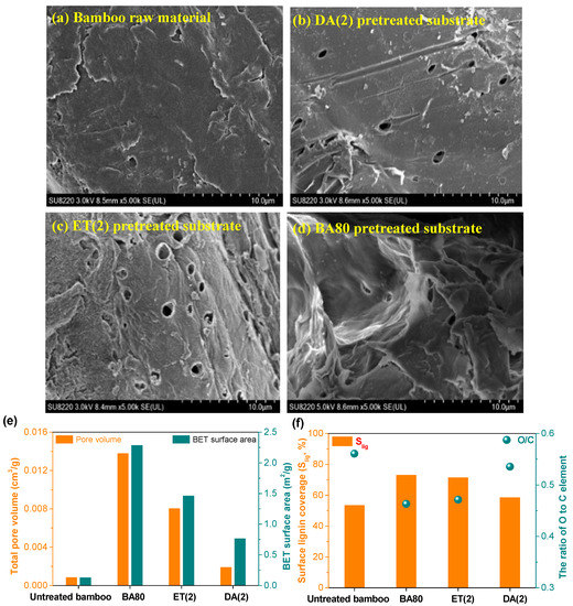 (a–d) SEM images, (e) total pore volume and BET surface area, and (f) surface lignin coverage (Slig) of bamboo raw material and pretreated solid substrates. Three pretreatments (DA(2), ET(2), and BA80) were conducted under optimized conditions that are detailed in Figure 4.