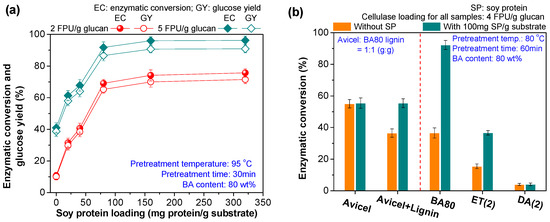 (a) Effect of soy protein loading on the enzymatic conversion of cellulose in BA80 pretreated substrate at two enzyme loading (2 and 5 FPU/g glucan); (b) comparisons of promotion effects of soy protein on Avicel and substrates from different pretreatments.