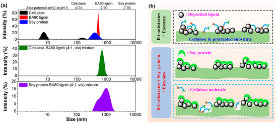 (a) Zeta potential and particle size of cellulase, BA80 lignin, soy protein and their mixtures; (b) a schematic diagram for promoting the enzymatic conversion of cellulose in BA80 pretreated solid substrate by using soy protein.
