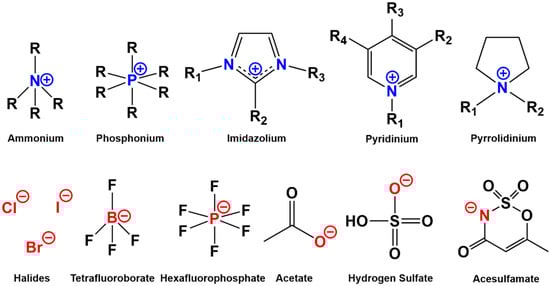Ionic liquids can almost be made of unlimited combinations of cations and anions, which are relatively less regular in size than those constituting simple salts such as sodium chloride (Figure 2) [32]. This results in crystalline structures with significantly lower lattice energies and melting points. The cations of most common ionic liquids varied from tetra-alkyl ammonium and tetra-alkyl phosphonium to imidazolium, pyridinium, and pyrrolidinium. Cations that are even more complex have been reported in the literature [33]. The anions also varied from simple halides, acetate, nitrate, hydrogen sulfate to more complicated anions such as acesulfamate [34]. As a result, it is possible to synthesize ionic liquids with a specific melting point, density, viscosity, hydrophilicity, and electrical conductivity to be used for a certain application or chemical process [35,36]. For the processing of wood, lignocellulose, and cellulose, imidazolium ionic liquids have been the most commonly used, which are all based on 1-alkyl-3-alkylimidazolium as a cation (Table 1).