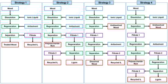 Upon a complete (homogeneous) or partial (heterogonous) dissolution of wood, different strategies have been used to separate the dissolved and undissolved fractions, which can be summarized into four (Figure 3). In the first strategy, the wood is partially or completely dissolved, and the reaction mixture is then fully regenerated using an anti-solvent without any fractionation. The regenerated wood is collected by centrifugation or filtration, and the ionic liquid is then recycled. This strategy is mostly used for processing wood into composites, as there is no need for wood fractionation. It is also used when the main aim of dissolution is breaking the recalcitrant of wood for biofuel production [101]. In the second strategy, the wood is dissolved, mainly completely, and the dissolved wood is fractioned to polysaccharide-rich fraction and lignin fraction by selective regeneration. The polysaccharide-rich fraction is usually explored for biofuel production, as the removal of lignin facilitates the enzymatic hydrolysis of the polysaccharides to simple sugars. It can also be fractioned further to hemicelluloses and cellulose using alkaline hydrolysis. The third and fourth strategies are mostly used for a thorough fractionation of wood upon partial dissolution. The third strategy separates the dissolved wood from the undissolved using centrifugation or filtration, which is then regenerated completely with no fractionation resulting in two fractions: dissolved wood and undissolved. While the fourth strategy fractions the dissolved wood further to lignin and polysaccharide fractions resulting in three fractions: undissolved wood, polysaccharide-rich fraction, and lignin. The undissolved wood in both strategies could be processed further to pulp fibers or cellulose nanoparticles. The procedure to separate the dissolved wood from the undissolved depends on the viscosity of the reaction mixture. If the reaction is viscous as in the case of using ionic liquids with no dilution, centrifugation is usually used as filtration could be impossible to perform. Sometimes, a co-solvent such as DMSO, DMF, or DMAc is added to the reaction mixture upon dissolution to allow the separation of wood fractions by filtration [102,103].