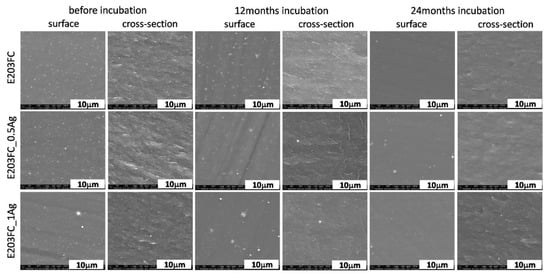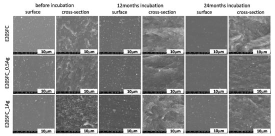 SEM images of surface and cross-section of pure polymer (E205FC) and polymer containing 0.5 wt % and 1.0 wt % of silver nanoparticles AgNPs before and after 12 and 24 months of incubation.