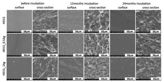SEM images of surface and cross-section of pure polymer (HD15) and polymer containing 0.5 wt % and 1.0 wt % of silver nanoparticles AgNPs before and after 12 and 24 months of incubation.