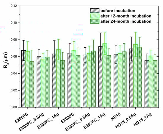 The arithmetical mean roughness (Ra) of pure polymers and polymers containing 0.5 wt % and 1.0 wt % of silver nanoparticles AgNPs. Statistical analysis showed no differences (p < 0.05) between materials before and after 12- and 24-month incubation.