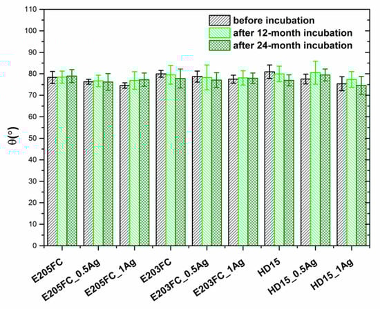 The contact angle analysis carried out for pure polymers and their nanosilver composites showed no change in the values, regardless of the modifying phase proportions (Figure 5). The contact angle equaled 78° for E205FC and 80° for E203FC and HD15 for the pure polymer matrices. These values did not alter significantly after 12- and 24-month incubation in deionized water (p < 0.05). The values of contact angle for the composites containing 0.5 wt % AgNPs before the incubation were 76° for E205FC and 78° for E203FC and HD15. In the case of the composites containing 1.0 wt % AgNPs, the angle values were: 75° for E205FC and HD15, and 78° for E203FC, respectively. The tests performed after 12 and 24 months of incubation confirmed the stable contact angle values for all the tested materials.