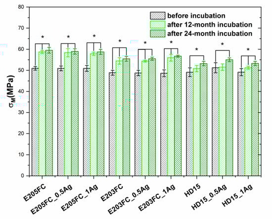 Tensile strength (σM) of pure polymers and polymers containing 0.5 wt % and 1.0 wt % of silver nanoparticles AgNPs. Statistically significant differences (p < 0.05) between materials before and after 12- and 24-month incubation are indicated by asterisk (*).