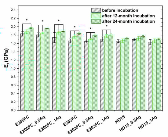 Young modulus (Et) of pure polymers and polymers containing 0.5 wt % and 1.0 wt % of silver nanoparticles AgNPs. Statistically significant differences (p < 0.05) between materials before and after 12- and 24-month incubation are indicated by asterisk (*).