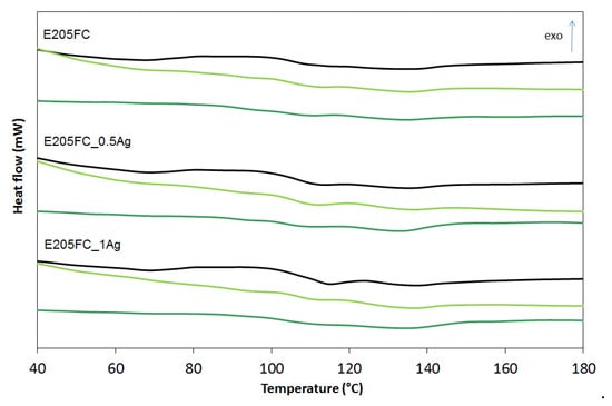 The differential scanning calorimetry (DSC) examined how the nanosilver introduction and the incubation time influenced the thermal properties of ABS terpolymers. The DSC curves are shown in Figure 8, Figure 9 and Figure 10 and the glass transition temperature (Tg) values are summarized in Table 1.