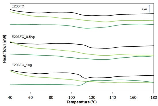 Glass transition temperature (Tg) of pure polymer (E203FC) and polymer containing 0.5 wt % and 1.0 wt % of silver nanoparticles AgNPs before incubation (black line), after 12 months (light green line) and after 24 months of incubation (dark green line).