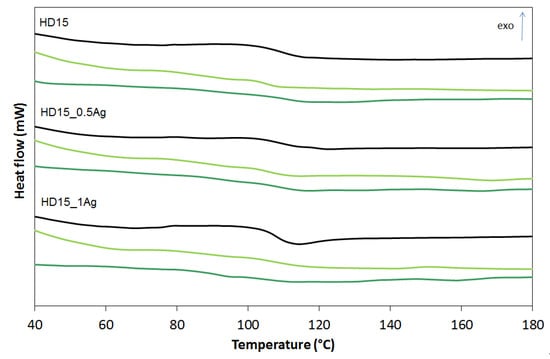 Glass transition temperature (Tg) of pure polymer (HD15) and polymer containing 0.5 wt % and 1.0 wt % of silver nanoparticles AgNPs before incubation (black line), after 12 months (light green line) and after 24 months of incubation (dark green line).