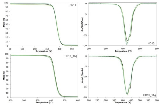 Thermogravimetric (TG) and derivative thermogravimetric (DTG) curves of pure polymer (HD15) and polymer containing 1.0 wt % of silver nanoparticles AgNPs before incubation (black line), after 12 months (light green line) and after 24 months of incubation (dark green line).
