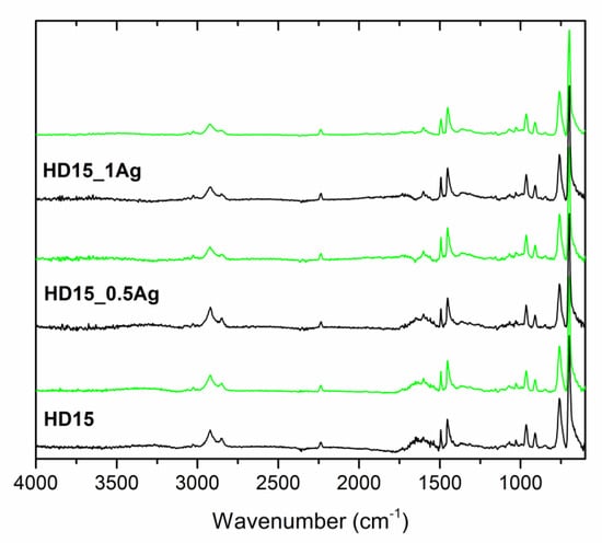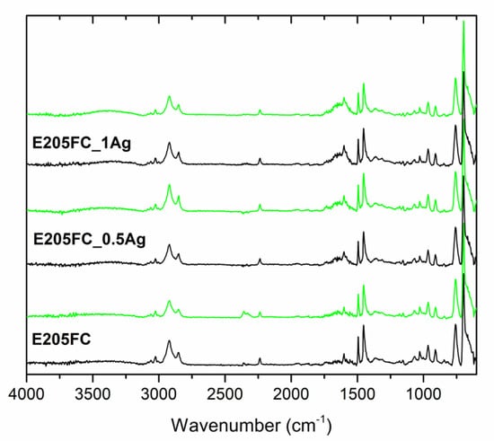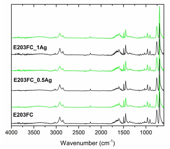 Attenuated total reflectance–Fourier transform infrared (ATR-FTIR) spectra of pure polymer (E205FC) and polymer containing 0.5 wt % and 1.0 wt % of silver nanoparticles AgNPs before incubation (black line) and after 24 months of incubation (light green line).