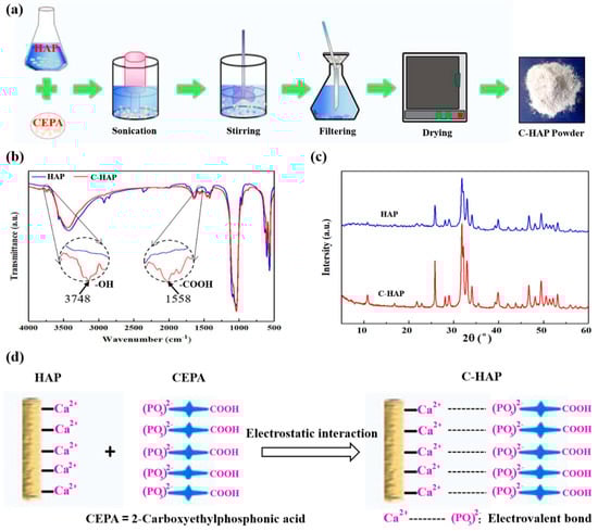 (a) The fabrication process of 2-carboxyethylphosphonic acid-modified hydroxyapatite (C-HAP) was powder, (b) Fourier transform infrared spectroscopy (FTIR) spectra and (c) X-ray diffractometry (XRD) pattern of C-HAP and hydroxyapatite (HAP), (d) Schematic of the possible interactions between HAP and C-HAP.