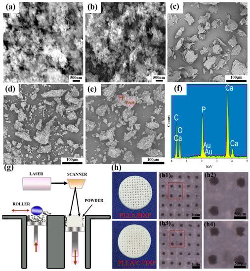 SEM morphologies of HAP, C-HAP nanoparticles, PLLA powder, PLLA/HAP and PLLA/C-HAP composite powder were shown in Figure 2a–e, respectively, and energy-dispersive X-ray spectroscopy (EDS) spectra at the p1 site was provided in Figure 2f. There was no obvious difference in the morphologies of HAP and C-HAP nanoparticles from Figure 2a,b. As was shown in Figure 2d,e, C-HAP nanoparticles were relatively more uniformly distributed in PLLA powder than were HAP nanoparticles, which might be due to the fact that the surface modification of HAP improved interfacial bonding. The scaffolds were fabricated by SLS using the powder shown in Figure 2g and the morphologies of porous PLLA/HAP and PLLA/C-HAP scaffolds are shown in Figure 2h. The PLLA/C-HAP scaffold displayed a little light yellow, while the PLLA/HAP scaffold was pure white, since the color of the CEPA was yellow. In order to promote bone regeneration, suitable structural properties and biomaterial composition are needed for the scaffold [,]. In particular, the interconnecting porous structure of the scaffold plays an important role in the growth of bone tissue [,]. In this study, the pore size, porosity, and other structural properties were simply controlled by the three-dimensional printing system. As reported in some studies, pore sizes between 200 and 400 μm were proposed as optimal for osteoconduction. Sara M et al. demonstrated that a pore size greater than 300 μm was beneficial for osteogenesis by facilitating capillary formation []. In order to analyze the pore size, SEM images of the PLLA/HAP and PLLA/C-HAP scaffolds were shown in Figure 2(h1–h4). It could be seen that the pore size of them was about 350 μm and was evenly distributed, which was especially beneficial for bone formation and regeneration. There was no big difference in the pore structure of PLLA/HAP and PLLA/C-HAP scaffolds, indicating that adding C-HAP had little negative influence on scaffold processing and shaping.