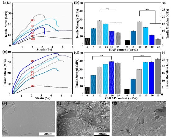 Typical tensile strain–stress curve of PLLA scaffolds with different contents of (a) C-HAP, (b) HAP, (c) tensile strength and (d) tensile modulus of the scaffolds, fracture surface of (e) PLLA scaffold, (f) PLLA/20% HAP scaffold, (g) PLLA/20% C-HAP scaffold.(where ** representing p < 0.01)