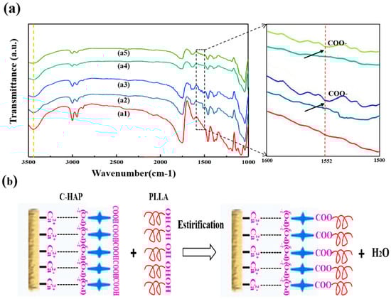 (a) FTIR spectra of different scaffolds (a1) PLLA scaffold, (a2) PLLA + 10% HAP scaffold, (a3) PLLA + 10% C-HAP scaffold, (a4) PLLA + 20% HAP scaffold, (a5) PLLA + 20% C-HAP scaffold, (b) The possible schematic of the possible interactions between C-HAP and PLLA matrix.