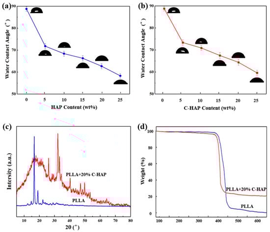 Water contact analysis (WCA) of PLLA scaffolds with different contents of (a) HAP, (b) C-HAP, (c) XRD pattern of PLLA/20% C-HAP and PLLA scaffolds, (d) TGA analysis of PLLA/20% C-HAP and PLLA scaffolds.