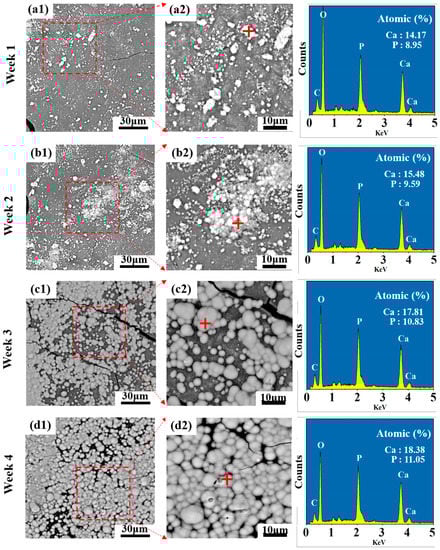 Bioactivity of the PLLA/20% C-HAP scaffold after SBF immersion for (a1) 7 days, (b1) 14 days, (c1) 21 days and (d1) 28 days. (a2), (b2), (c2), and (b2) are the corresponding enlarged image corresponds to the rectangular area of the graph.