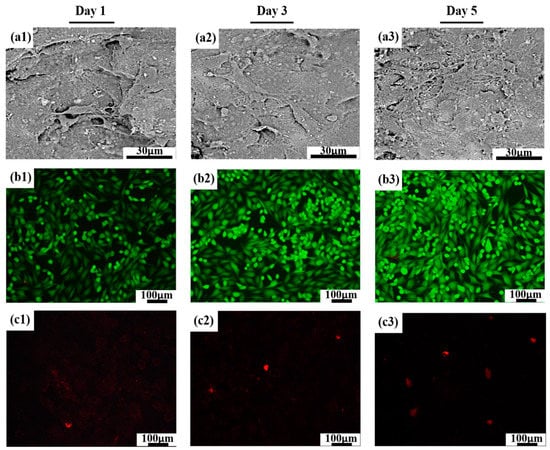SEM was used to illustrate the morphology of MG-63 cells attached to the surface in Figure 8a1–a3. In general, MG-63 cells exhibited an extended and well-spread morphology and intimately attached to the surface of the PLLA/20% C-HAP scaffold. Additionally, as time went on, the numbers of cells were denser, and cells maintained a more close physical contact with one another. In addition, it could be seen that MG-63 cells produced some secretion on the scaffold. Besides, immunofluorescence was used to analyze the viability of MG-63 cells. The live MG-63 cells were stained to green and the dead MG-63 cells were stained to red. From the results, we knew that the number of cells gradually increased with the culture time increasing, which indicated the scaffold was nontoxic and beneficial for cell growth []. Some reports showed that interconnected and porous structures of the scaffold had the potential to support cell proliferation and growth [,]. The PLLA scaffold was a lack of cytocompatibility, thus the reason might be that HAP was a kind of bioactive ceramic rich in Ca2+ and (PO4)3− to enhance the binding of cell and scaffold []. In our experiment, the adhesion, as well as proliferation of MG-63 cells, was fairly good by adding 20% C-HAP into the PLLA matrix, but in the study of Smieszek et al. [], porous PLLA scaffolds with 10 wt % HAP could significantly improve the adhesion and proliferation of adipose-derived stromal cells. Our results differ, not only because of the methods used to prepare bone scaffold, but also because MG-63 cells have special cellular physiological characteristics. Therefore, the experiments indicated that the culture microenvironment modulated by incorporating C-HAP into the PLLA matrix was beneficial for MG-63 cell adhesion, growth and proliferation.